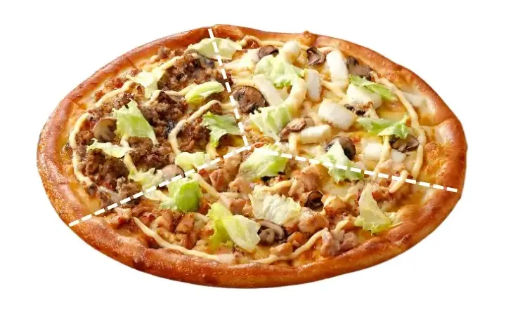 ・テリヤキイカ:イカ、オニオン、マッシュルーム、レタス、プレミアムチーズブレンド、エキストラチーズ、テリヤキソース、マヨネーズ